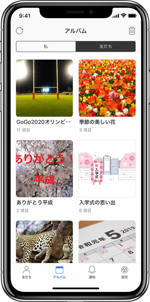 親友、恋人、クラス、部活、会社関連で共有したいとき、アルバム毎に共有のお友だちが選択できるから、プライベート、公私も区別して利用できる写真、動画共有アプリをぜひ体験してください。